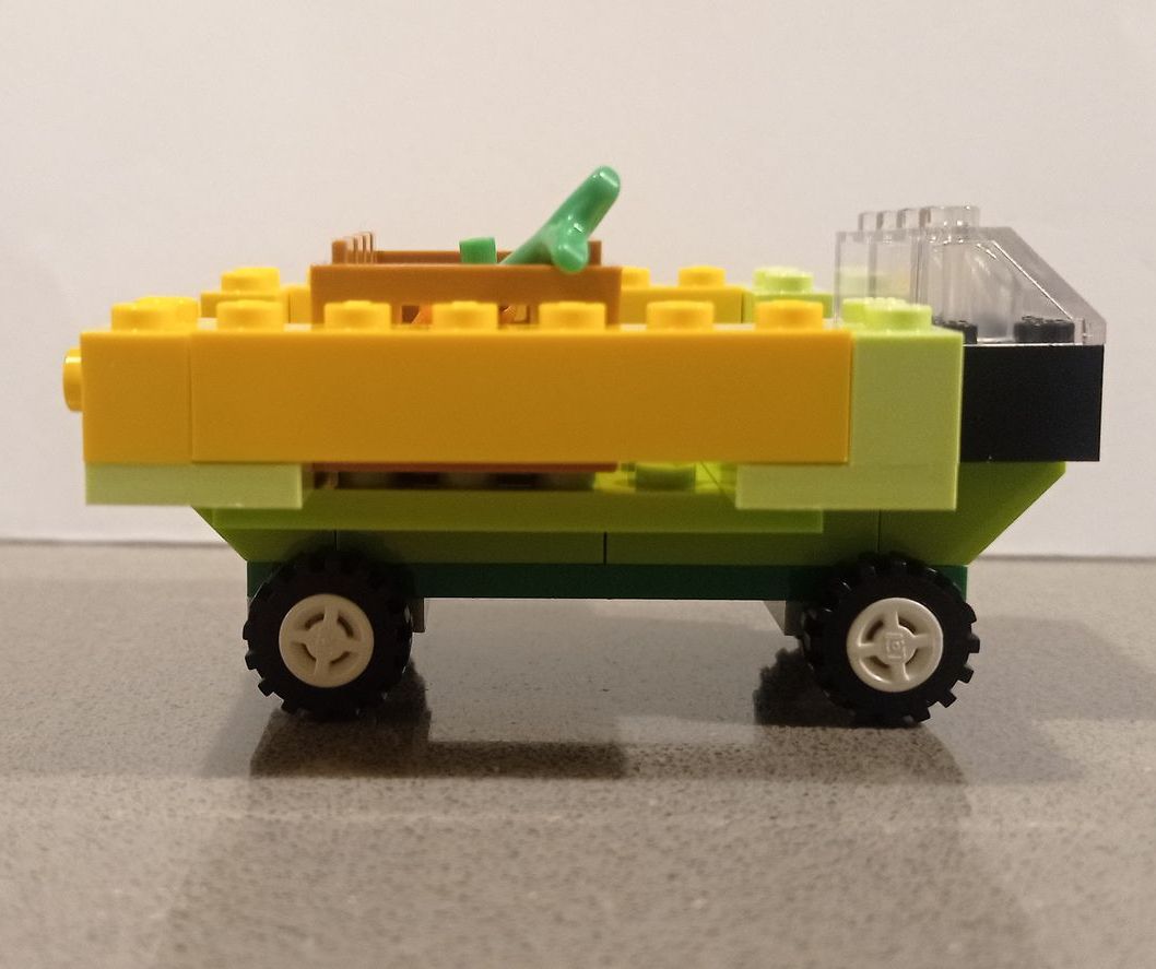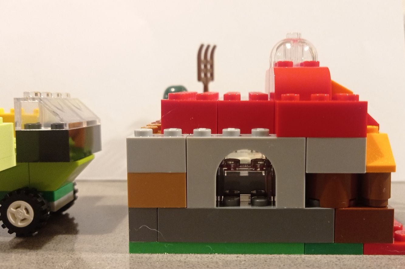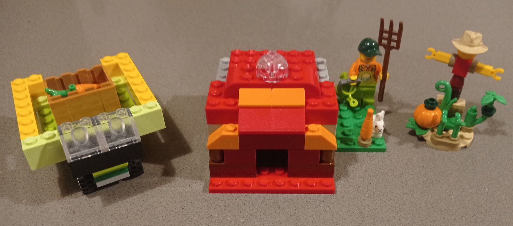 Carrots loaded on the truck, by the scarecrow, the farmer and their house. Will the bunny eat all the carrots?